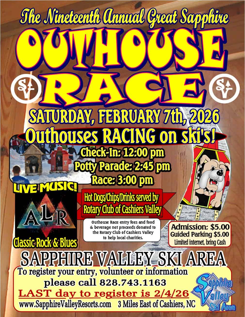 ShareTODAY is the LAST day to enter your vehicle in the 19th Annual Great Sapphire Outhouse Race! By Lisa JewellPosted Wednesday, Feb 4, 2026 We only have a limited number of slots open so get your privy signed up today! 828.743.1163 SapphireValleyResorts.com